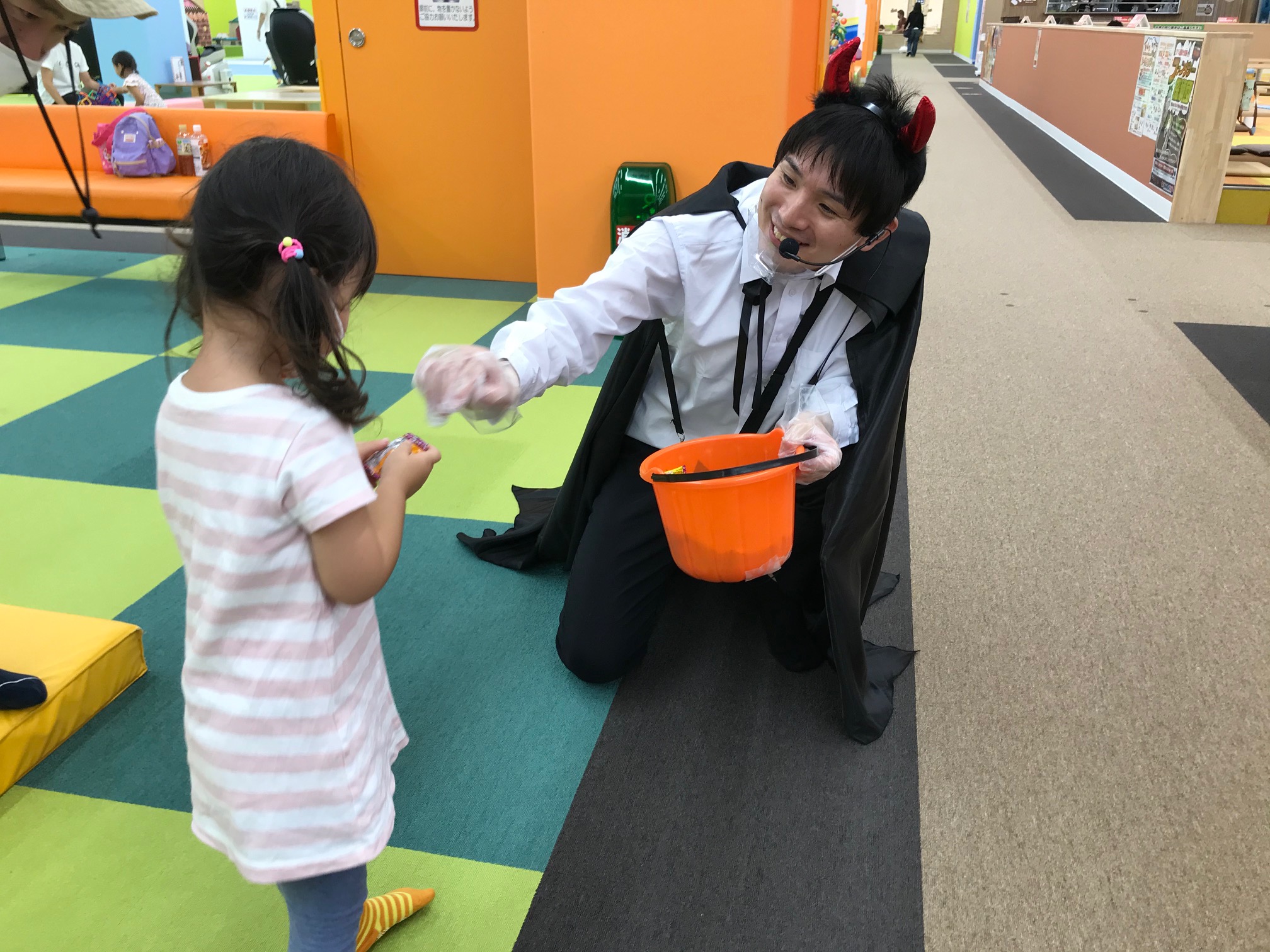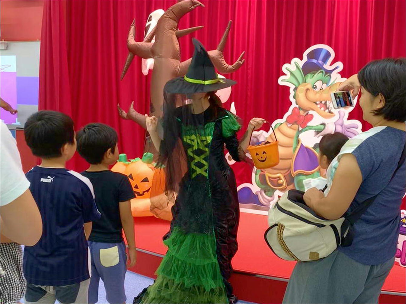 お店の中に登場するハロウィンのキャラクターに元気いっぱいに合言葉を言おう!