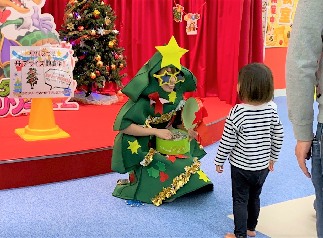 お店の中に登場するクリスマスのキャラクターに元気いっぱいに合言葉を言おう!